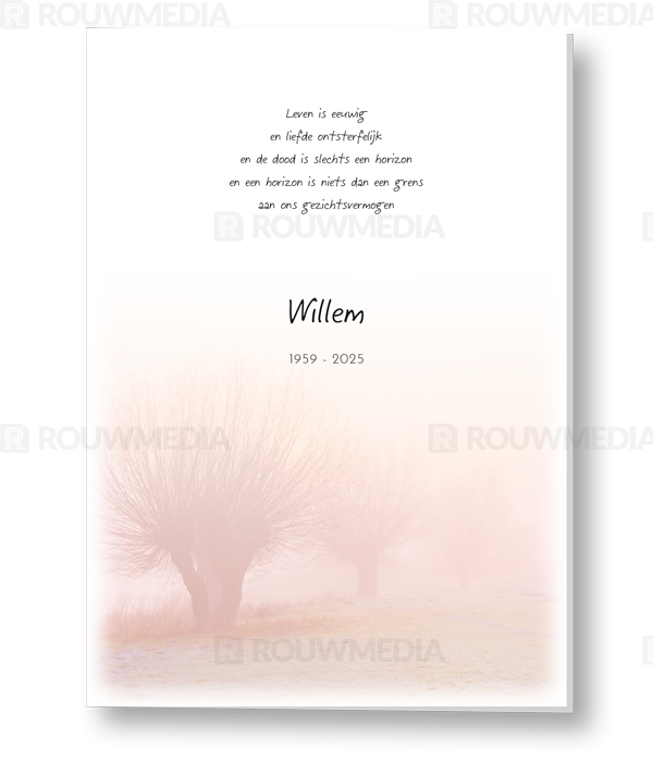 In deze staande rouwkaart wordt een beeldvullende afbeelding weergegeven van knotwilgen in de vroege ochtend. Onder de afbeelding kunt u de naam en datums weergeven.