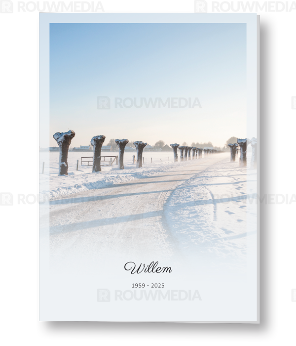 In deze staande rouwkaart wordt een beeldvullende afbeelding weergegeven van knotwilgen in de sneeuw. Onder de afbeelding kunt u de naam en datums weergeven.