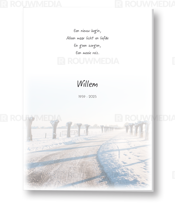 In deze staande rouwkaart wordt een beeldvullende afbeelding weergegeven van knotwilgen in de sneeuw. Onder de afbeelding kunt u de naam en datums weergeven.