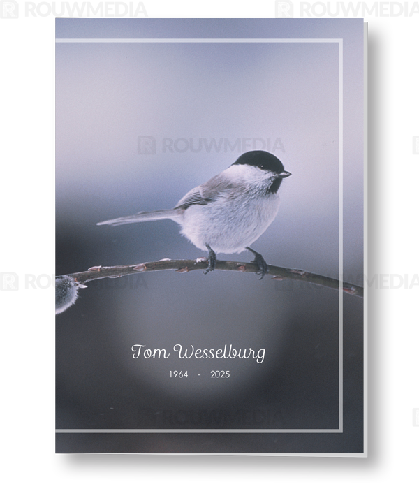In de staande rouwkaart wordt een beeldvullende foto weergegeven van een koolmees op een winters takje.