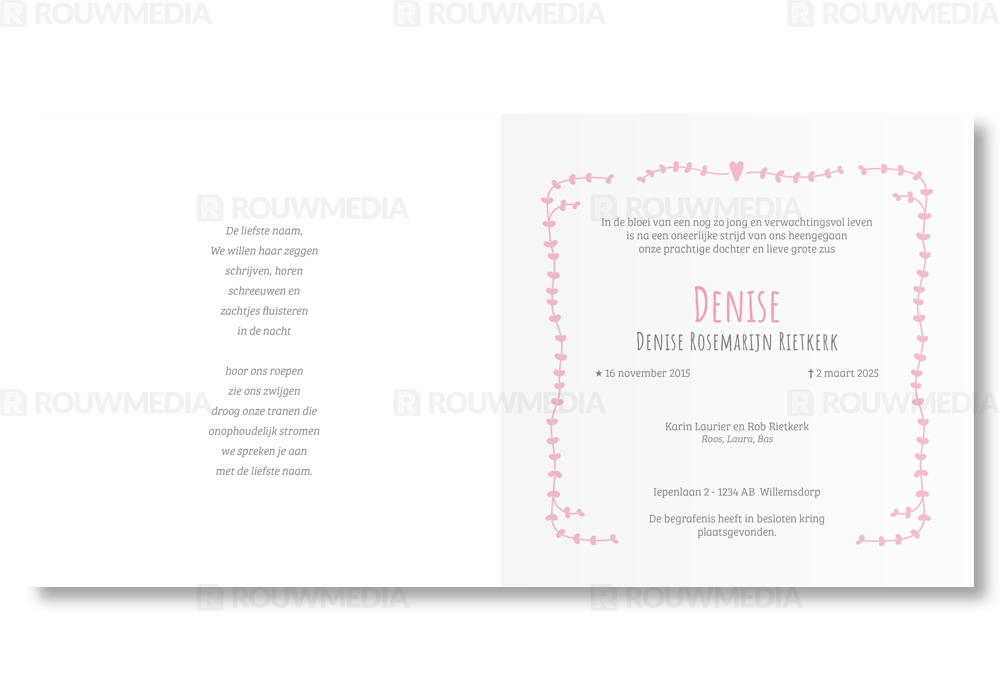 Rouwkaart met krans kader en roze details. Naam kan onder in de Rouwkaart geplaatst worden.