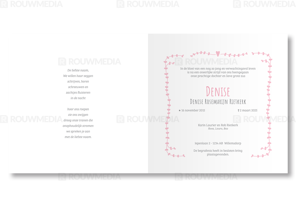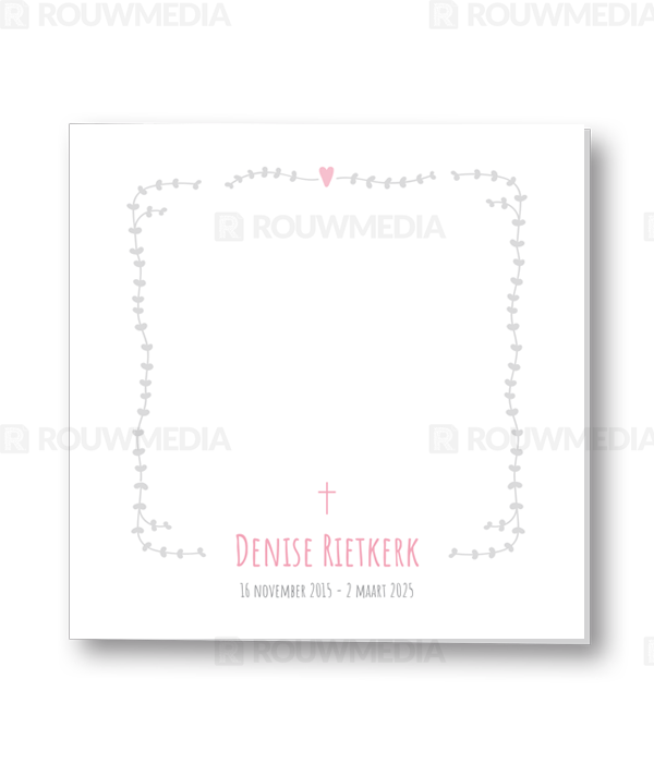 Rouwkaart met krans kader en roze details. Naam kan onder in de Rouwkaart geplaatst worden.