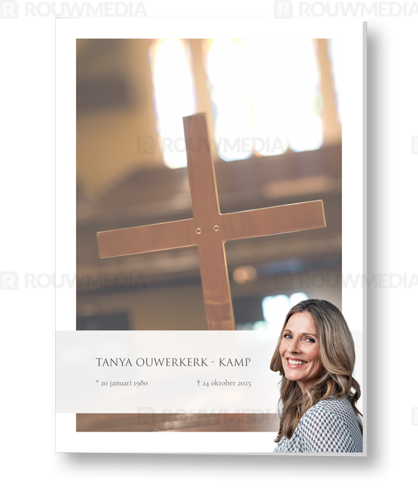 In de staande rouwkaart wordt een beeldvullende foto weergegeven van een kruis in de kerk. Daarnaast is het mogelijk om een portret/foto naar eigen keuze rechts weer te geven naast de naam en datums.