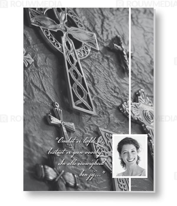 In deze staande rouwkaart wordt een beeldvullende grijze afbeelding weergegeven van kruisen aan de muur. Daarnaast is het mogelijk om een foto/portret en gedicht/citaat weer te geven.