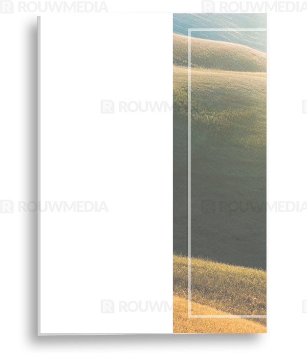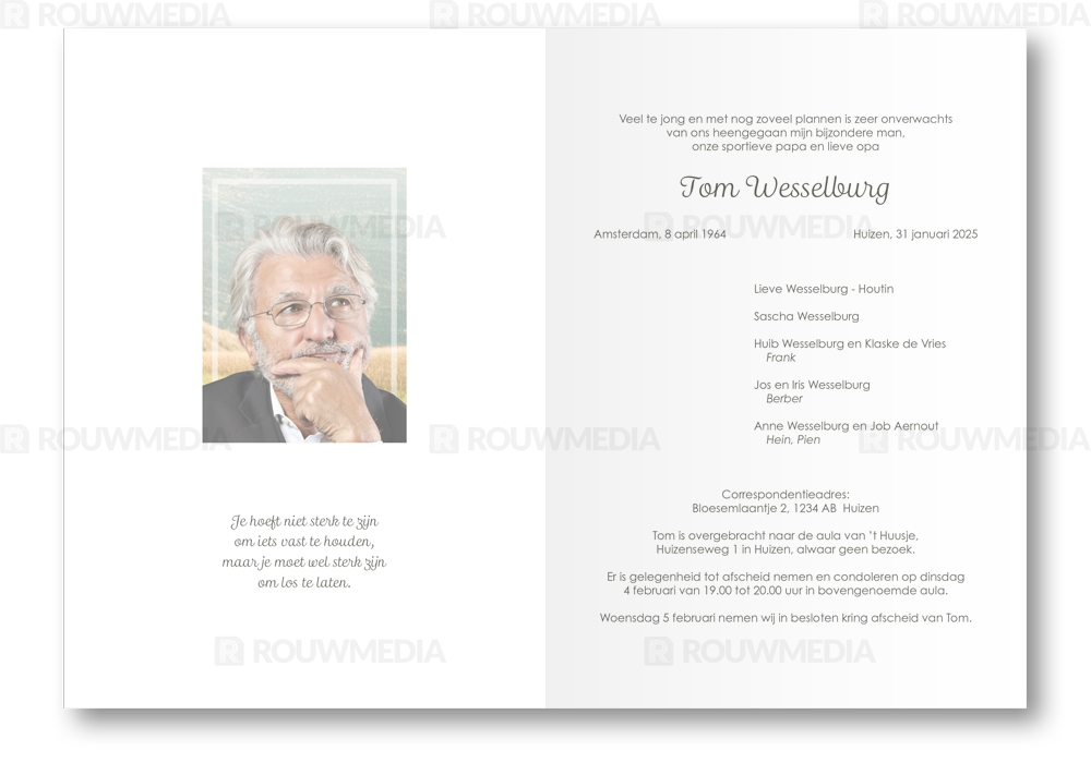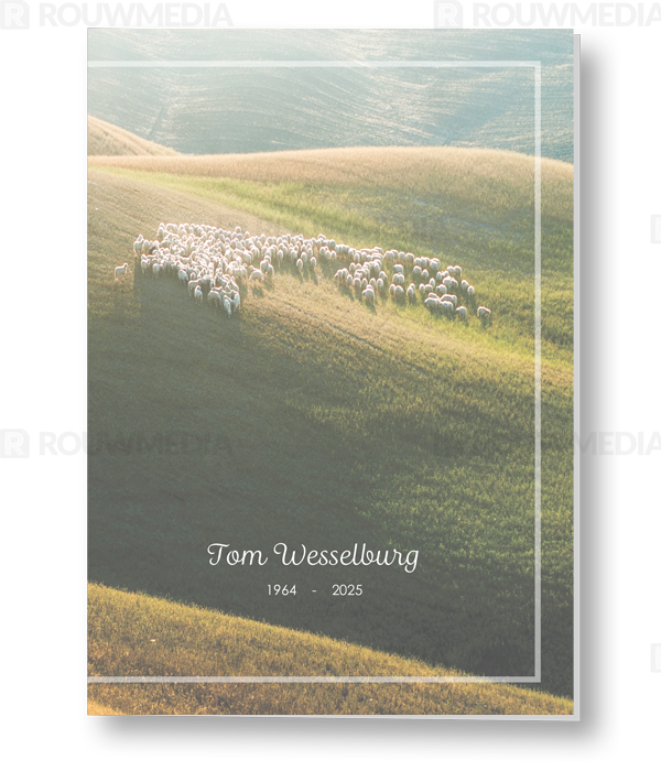 In de staande rouwkaart wordt een beeldvullende foto weergegeven van een kudde schapen. Daarnaast is het mogelijk om een portret/foto naar eigen keuze rechts weer te geven naast de naam en datums.