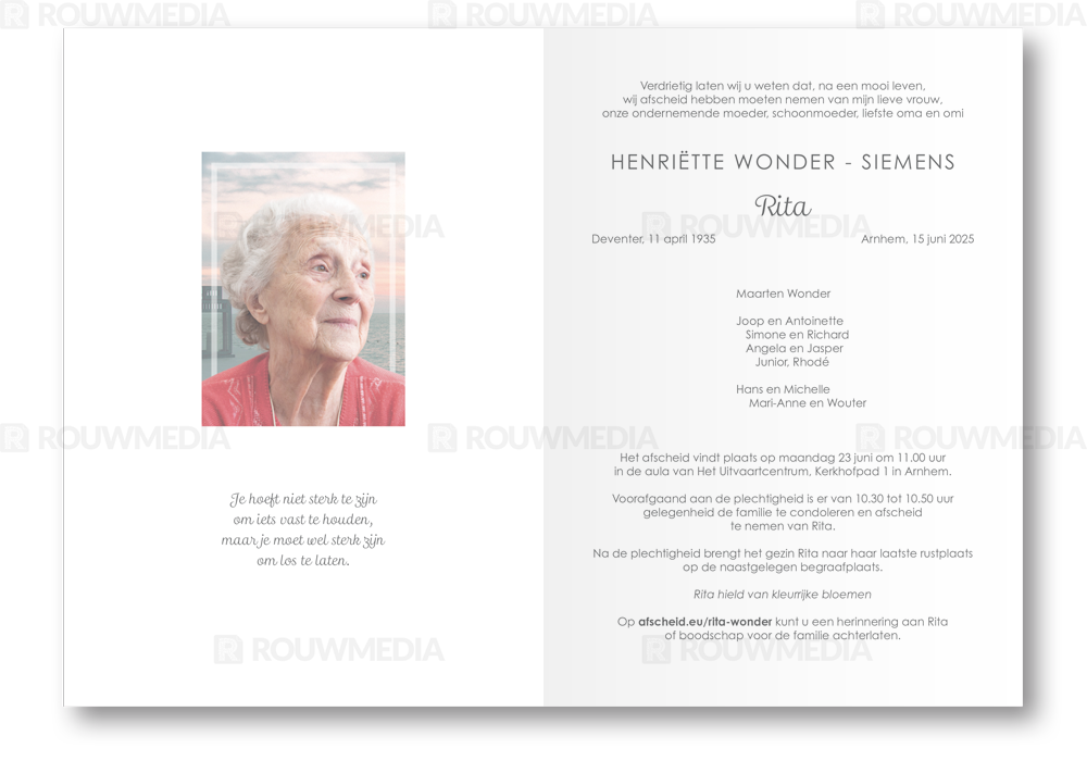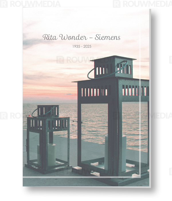 In de staande rouwkaart wordt een beeldvullende foto weergegeven van lantaarns met zeezicht.