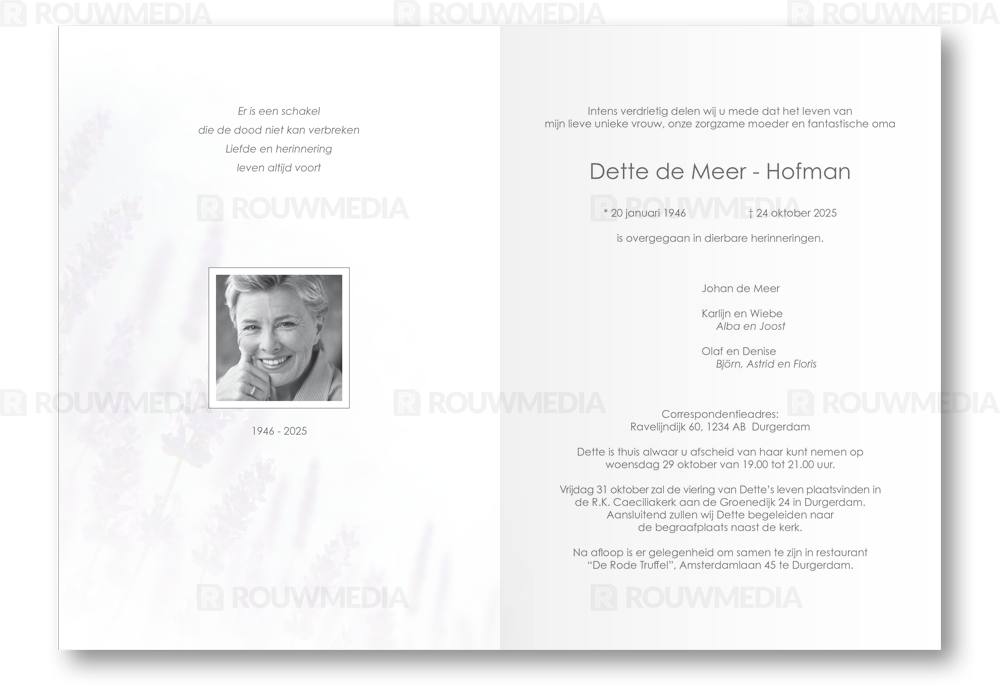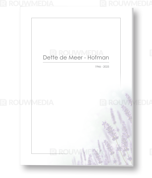 Deze rouwkaart toont in een simpele stijl hoe een afbeelding de focus kan krijgen in een kaart, maar wel de serene rust bewaart. Voor deze kaart is er gekozen voor lavendeltakken.