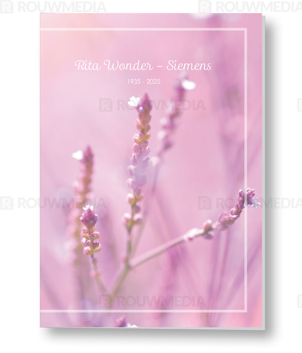 In de staande rouwkaart wordt een beeldvullende foto weergegeven van paarse lavendel.