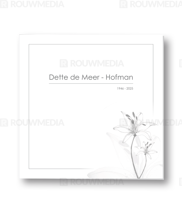 Deze vierkante rouwkaart toont in een simpele stijl hoe een afbeelding de focus kan krijgen in een kaart, maar wel de serene rust bewaart. Voor deze kaart is er gekozen voor geïllustreerde witte lelies.
