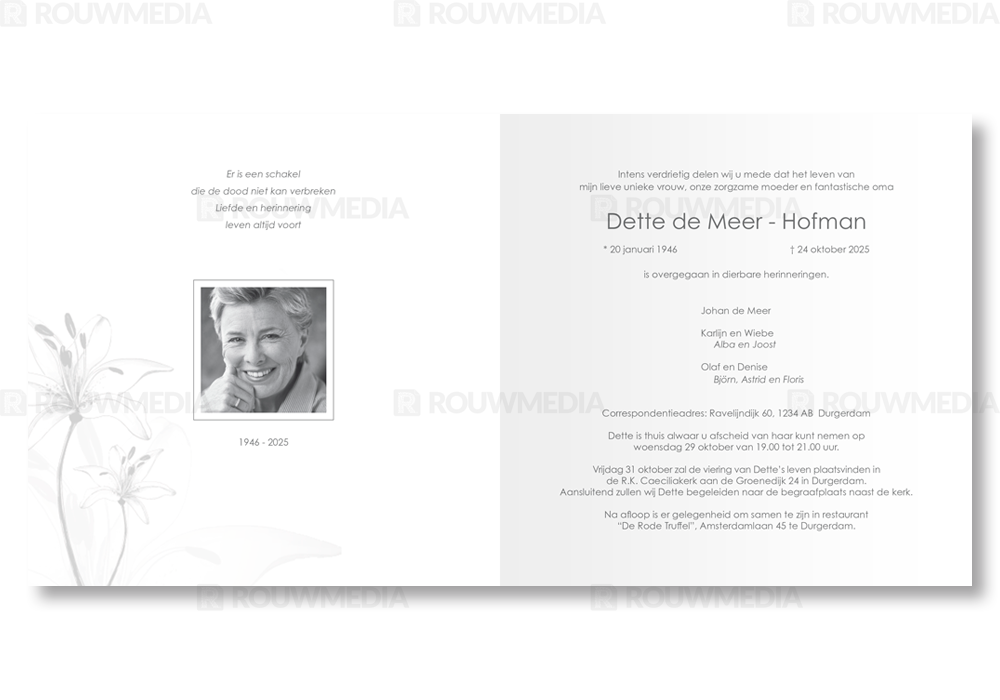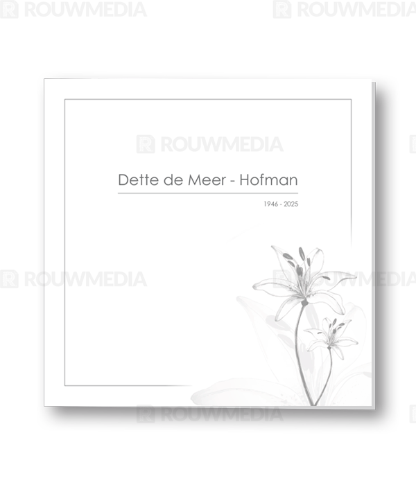 Deze vierkante rouwkaart toont in een simpele stijl hoe een afbeelding de focus kan krijgen in een kaart, maar wel de serene rust bewaart. Voor deze kaart is er gekozen voor geïllustreerde witte lelies.