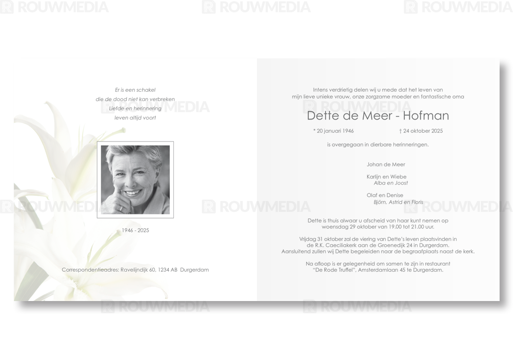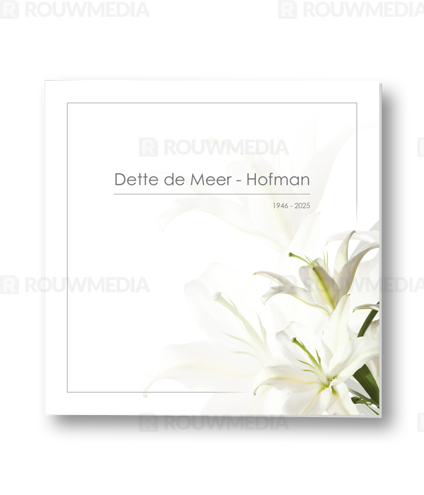 Deze vierkante rouwkaart toont in een simpele stijl hoe een afbeelding de focus kan krijgen in een kaart, maar wel de serene rust bewaart. Voor deze kaart is er gekozen voor witte lelies.
