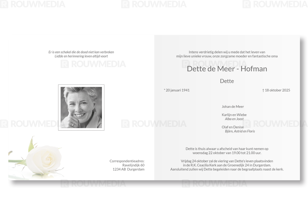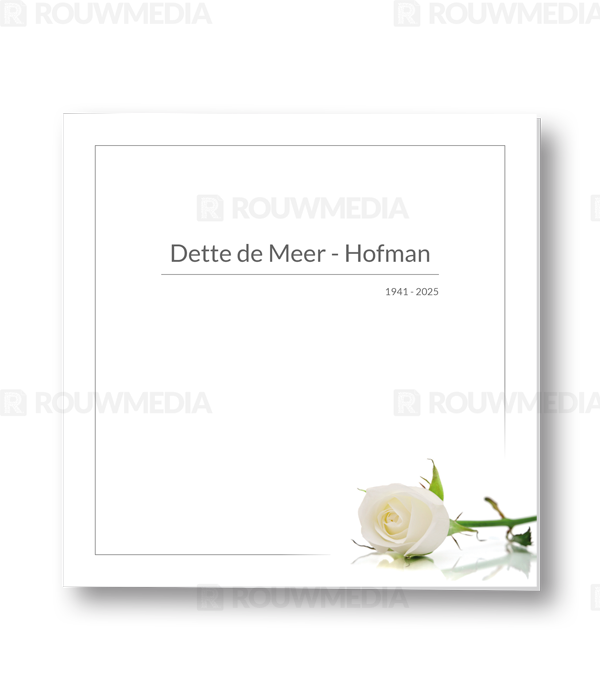 Deze vierkante rouwkaart toont in een simpele stijl hoe een afbeelding de focus kan krijgen in een kaart, maar wel de serene rust bewaart. Voor deze kaart is er gekozen voor een liggende witte roos.