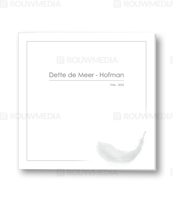 Deze vierkante rouwkaart toont in een simpele stijl hoe een afbeelding de focus kan krijgen in een kaart, maar wel de serene rust bewaart. Voor deze kaart is er gekozen voor een liggende veer.