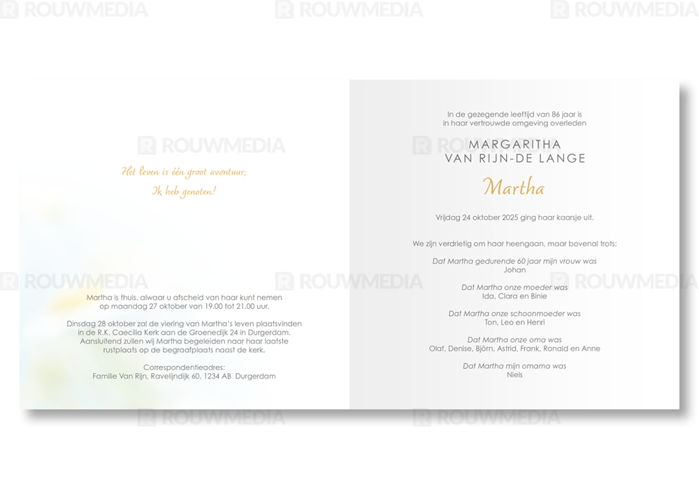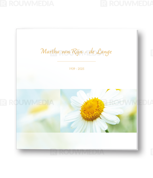 Op deze staande rouwkaart wordt een madelief weergegeven. Daarboven is het mogelijk om een naam met datums weer te geven.