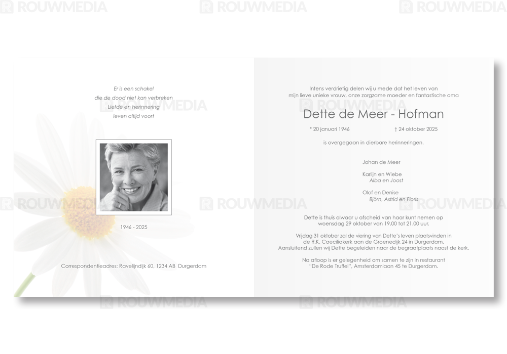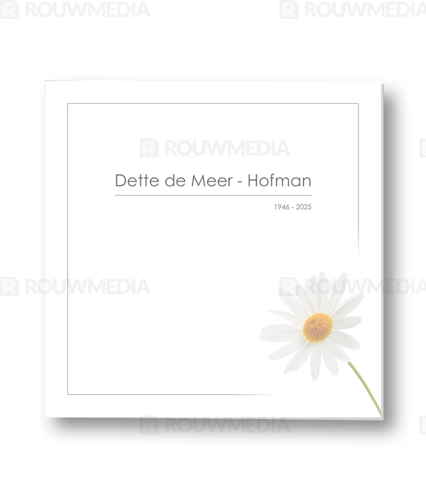 Deze vierkante rouwkaart toont in een simpele stijl hoe een afbeelding de focus kan krijgen in een kaart, maar wel de serene rust bewaart. Voor deze kaart is er gekozen voor een madeliefje.
