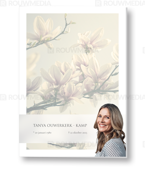 In de staande rouwkaart wordt een beeldvullende foto weergegeven van een magnolia tak. Daarnaast is het mogelijk om een portret/foto naar eigen keuze rechts weer te geven naast de naam en datums.