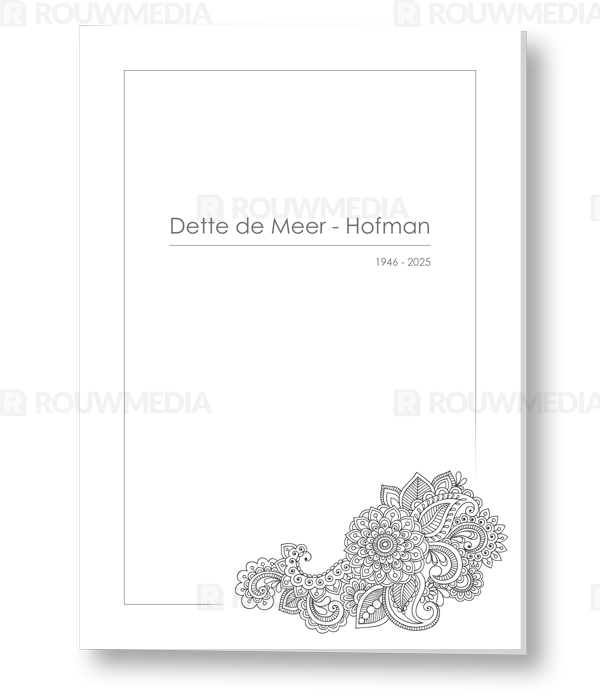 Deze rouwkaart toont in een simpele stijl hoe een afbeelding de focus kan krijgen in een kaart, maar wel de serene rust bewaart. De afbeelding die voor deze kaart is gekozen is een schets van een bloemen mandela.