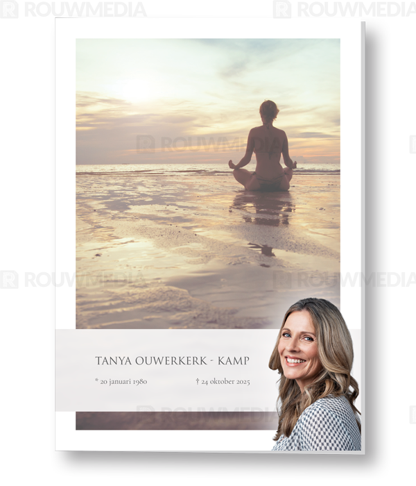 In de staande rouwkaart wordt een beeldvullende foto weergegeven van mediterende vrouw op het strand. Daarnaast is het mogelijk om een portret/foto naar eigen keuze rechts weer te geven naast de naam en datums.