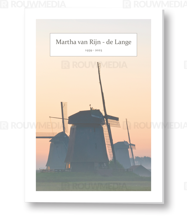 In de staande rouwkaart wordt een beeldvullende foto weergegeven van drie molens.