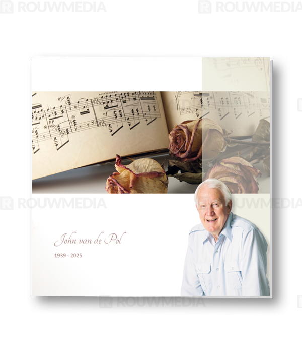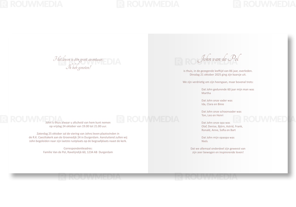 Rouwkaart met mogelijkheid om eigen portret/afbeelding weer te geven in langwerpige balk. Aan de rechterkant wordt een transparante balk weergegeven om de kaart wat meer kleur te geven en speelser te maken.