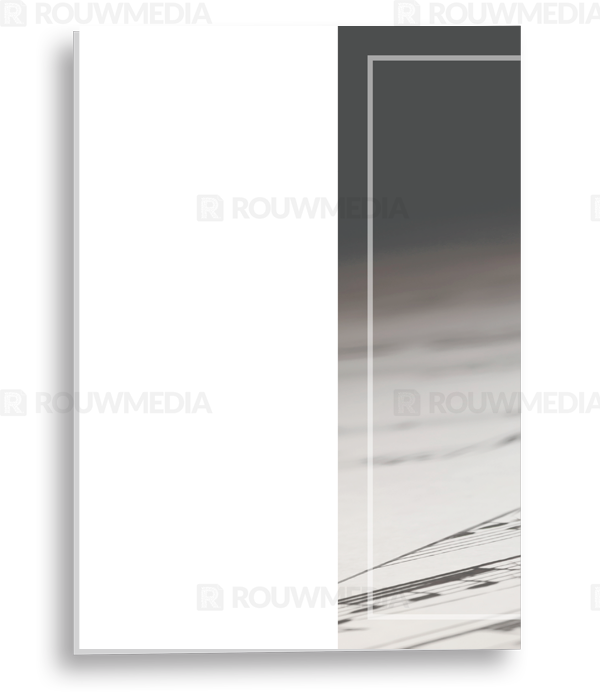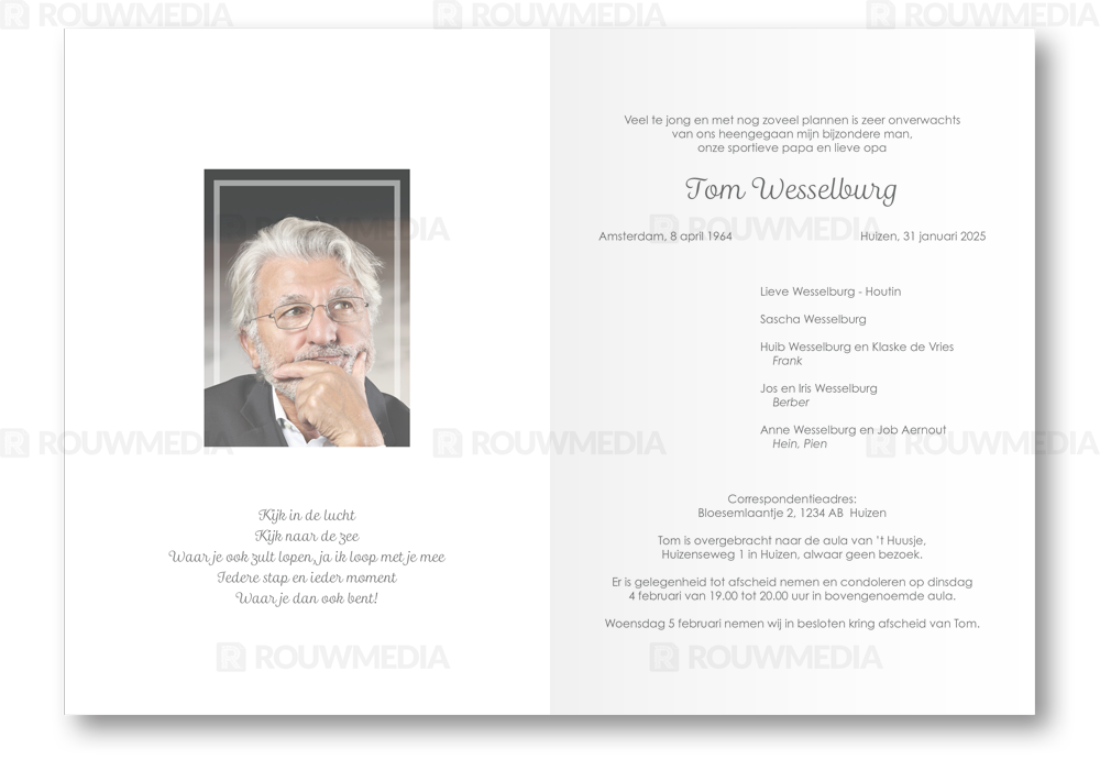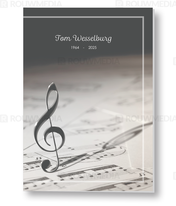 In de staande rouwkaart wordt een beeldvullende foto weergegeven van een muzieknoot op een muziekblad.