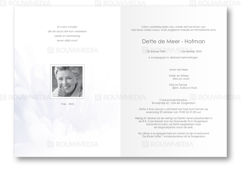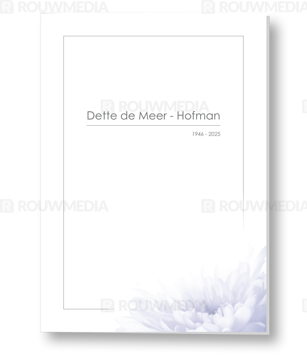 Deze rouwkaart toont in een simpele stijl hoe een afbeelding de focus kan krijgen in een kaart, maar wel de serene rust bewaart. Voor deze kaart is er gekozen voor een open blauwe bloem.