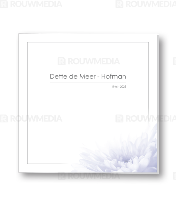 Deze vierkante rouwkaart toont in een simpele stijl hoe een afbeelding de focus kan krijgen in een kaart, maar wel de serene rust bewaart. Voor deze kaart is er gekozen voor een open blauwe bloem.