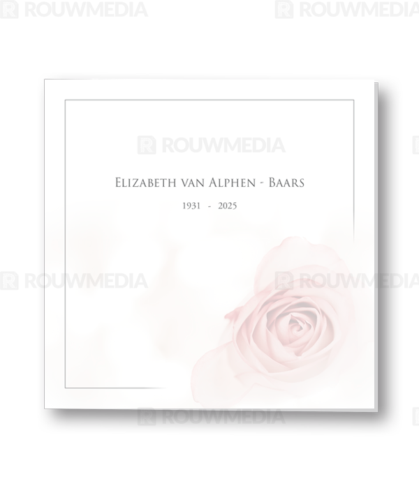 Voor deze vierkante rouwkaart is een dun grijs kader gebruikt dat in de rechterhoek wordt onderbroken door een afbeelding van een roze open roos.