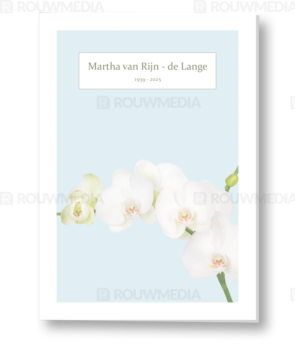 In de staande rouwkaart wordt een beeldvullende foto weergegeven van een witte orchidee.