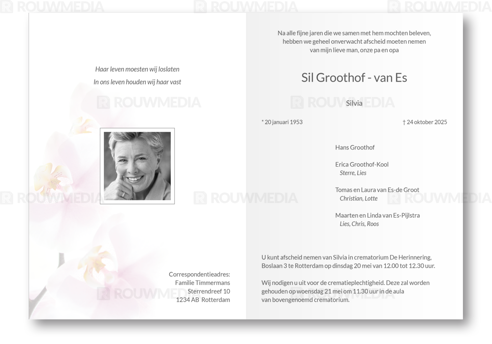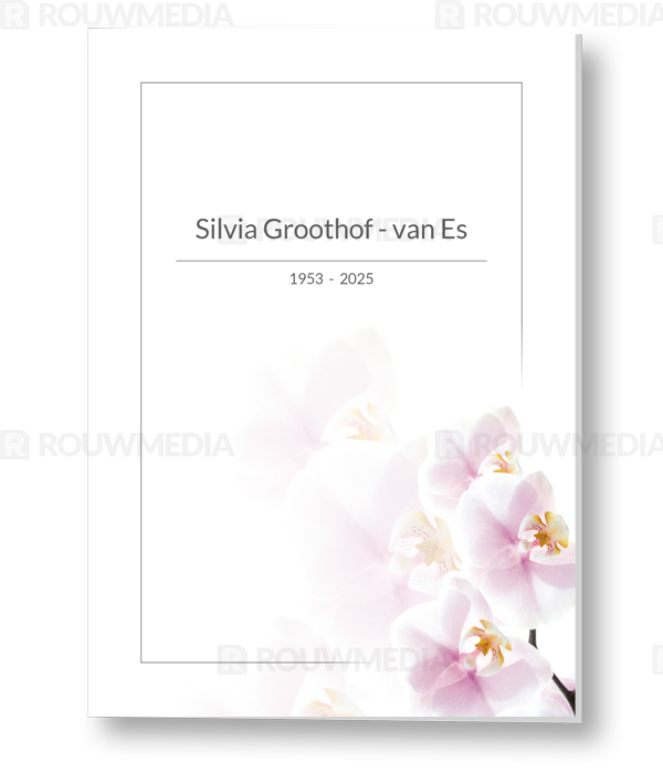 Deze rechthoekige rouwkaart toont in een simpele stijl hoe een afbeelding de focus kan krijgen in een kaart, maar wel de serene rust bewaart. Voor deze kaart is er gekozen voor een witte orchidee.