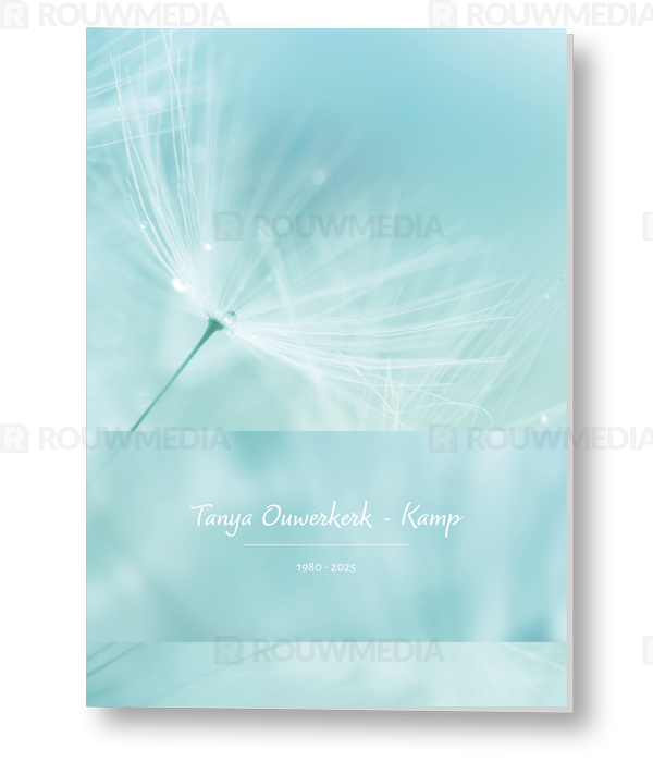 In deze staande rouwkaart wordt een beeldvullende afbeelding weergegeven die geïnspireerd is op de natuur. Over deze afbeelding is een wazige balk geplaatst zodat er ruimte ontstaat om een naam met datum weer te geven.