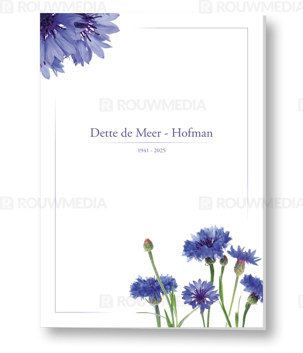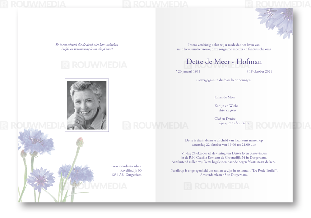 Op deze kaart worden paarse chrysanten weergegeven en een paars kader, aan de binnenzijde van de kaart kan een portretfoto worden geplaatst met een kader eromheen.