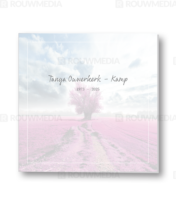Voor deze vierkante rouwkaart is een dun grijs kader gebruikt. Achter dit kader is een beeldvullende afbeelding van een paarse heide weer gegeven.