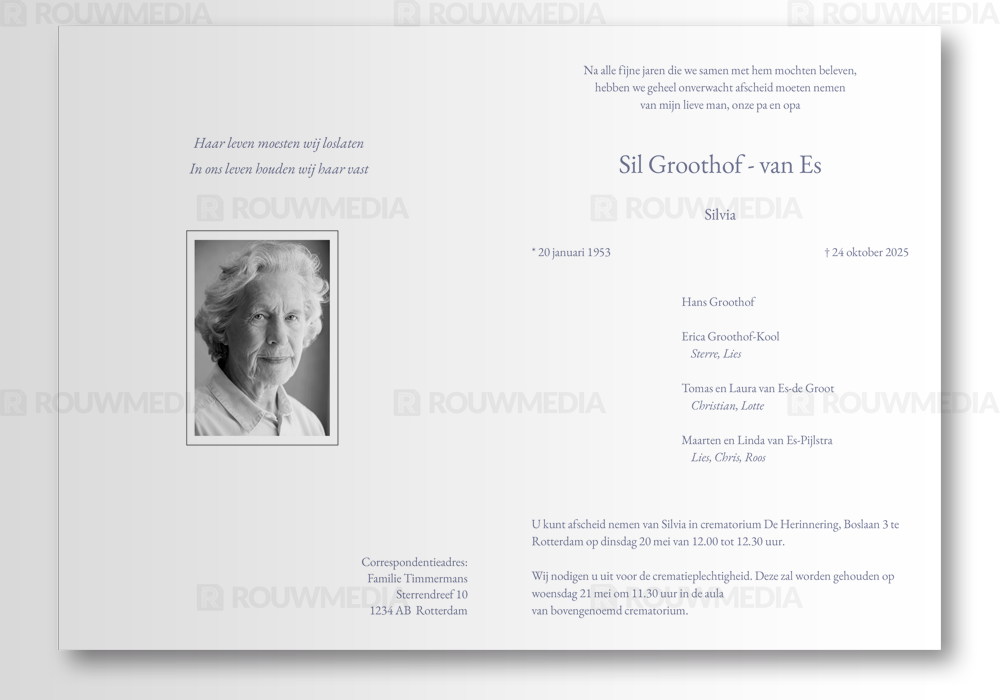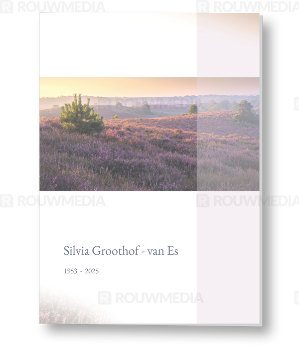 Deze staande kaart heeft een horizontale afbeelding van een paarse heide. Daarnaast kunt u een portret of afbeelding tonen. Aan de rechterkant wordt een transparante balk weergegeven om de kaart wat meer kleur te geven en speelser te maken.