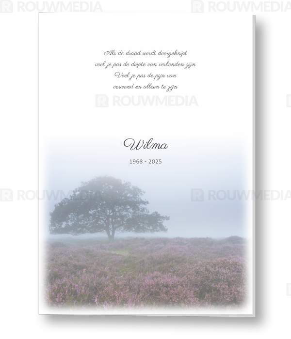 In deze staande rouwkaart wordt een beeldvullende afbeelding weergegeven van een paarse heide bij zonsopkomst. Onder de afbeelding kunt u de naam en datums weergeven.