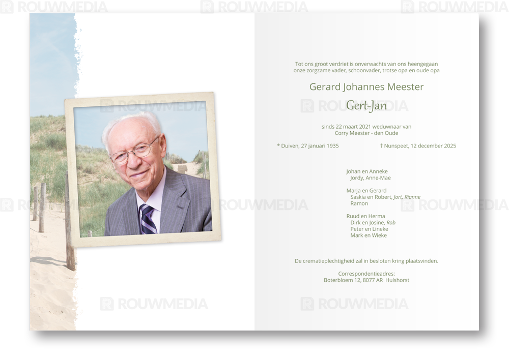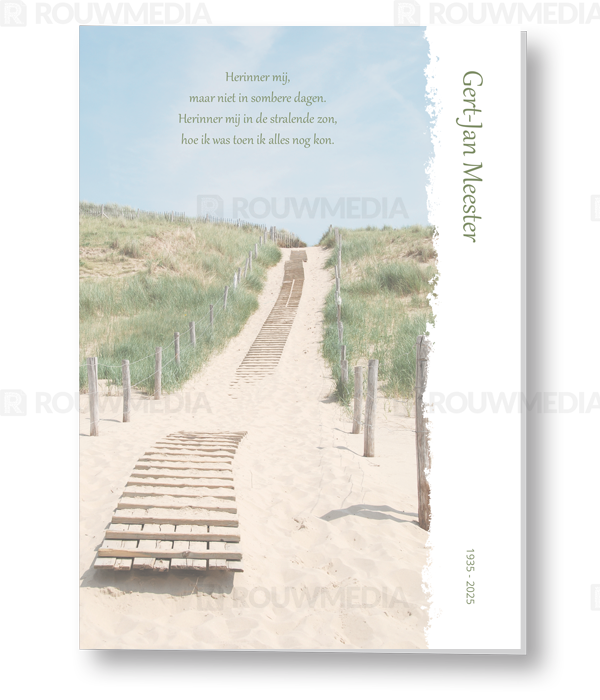 In deze rechthoekige rouwkaart wordt een beeldvullende afbeelding weergegeven van een pad door de duinen. Daarnaast is het mogelijk om de naam, datums en gedicht/citaat weer te geven.