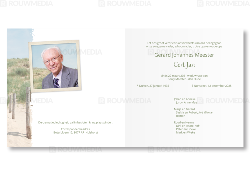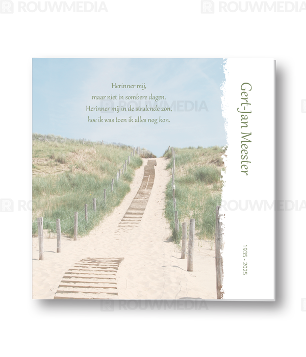 In deze vierkante rouwkaart wordt een beeldvullende afbeelding weergegeven van een pad door de duinen. Daarnaast is het mogelijk om de naam, datums en gedicht/citaat weer te geven.