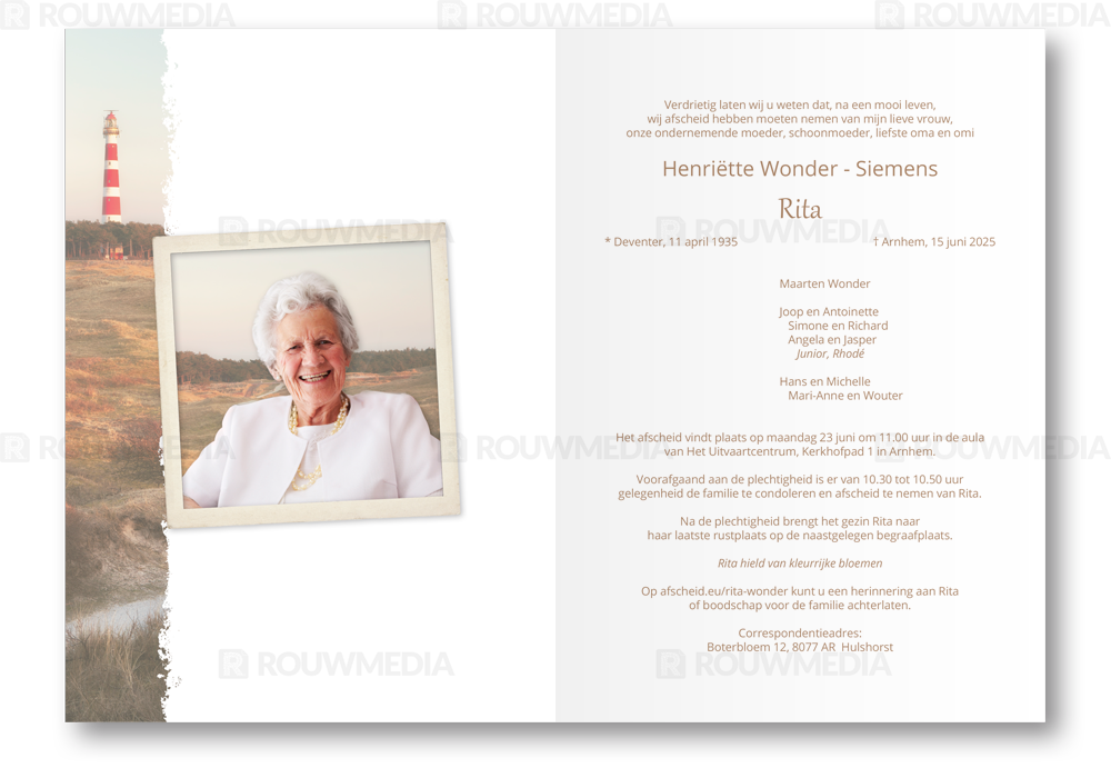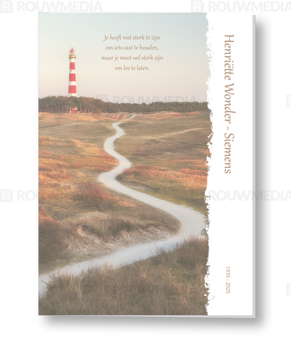 In deze rechthoekige rouwkaart wordt een beeldvullende afbeelding weergegeven van een pad naar de vuurtoren. Daarnaast is het mogelijk om de naam, data en gedicht/citaat weer te geven.