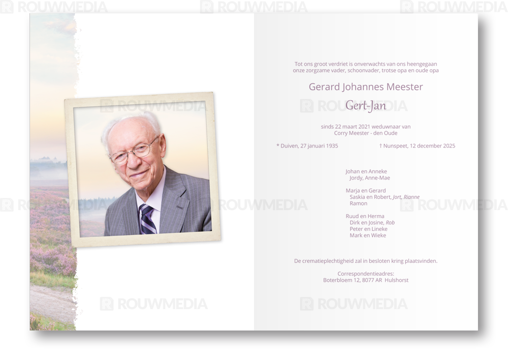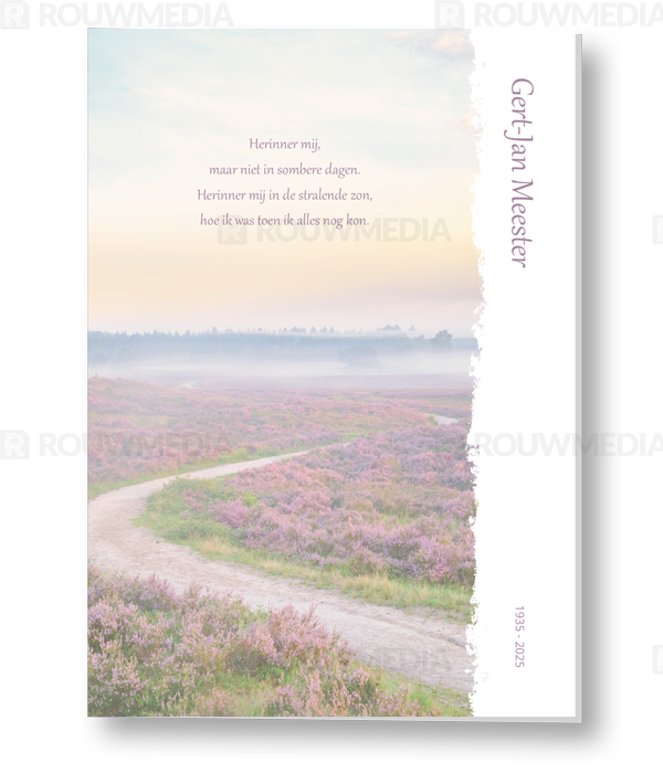 In deze rechthoekige rouwkaart wordt een beeldvullende afbeelding weergegeven van een pad op de hei. Daarnaast is het mogelijk om de naam, datums en gedicht/citaat weer te geven.