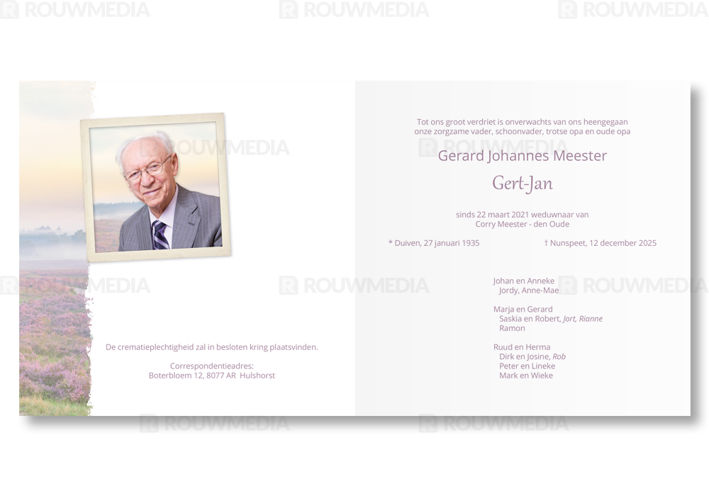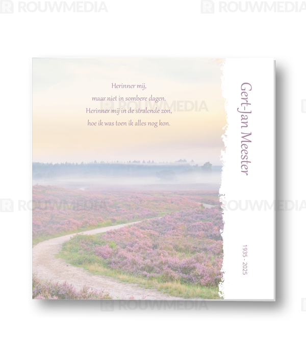 In deze vierkante rouwkaart wordt een beeldvullende afbeelding weergegeven van een pad op de hei. Daarnaast is het mogelijk om de naam, datums en gedicht/citaat weer te geven.