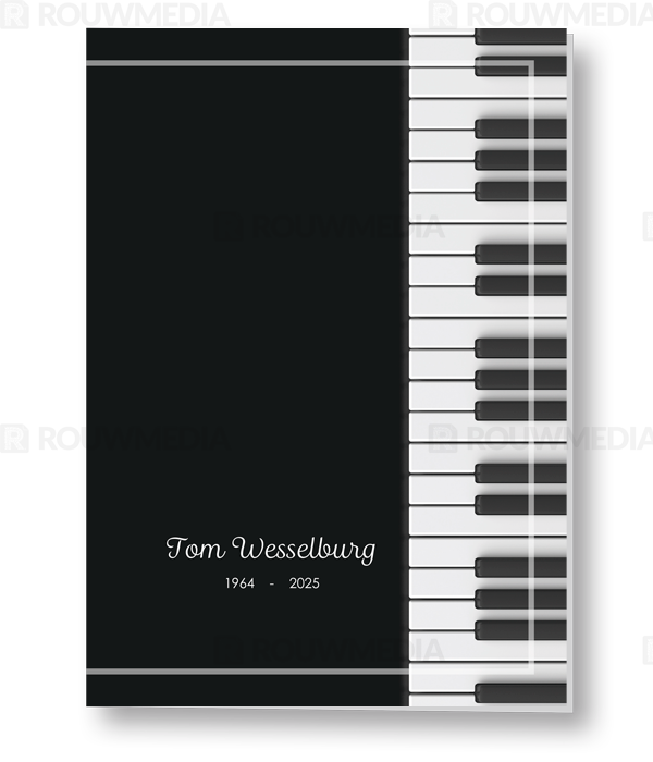 In de staande rouwkaart wordt een beeldvullende foto weergegeven van een piano op een zwarte achtergrond.