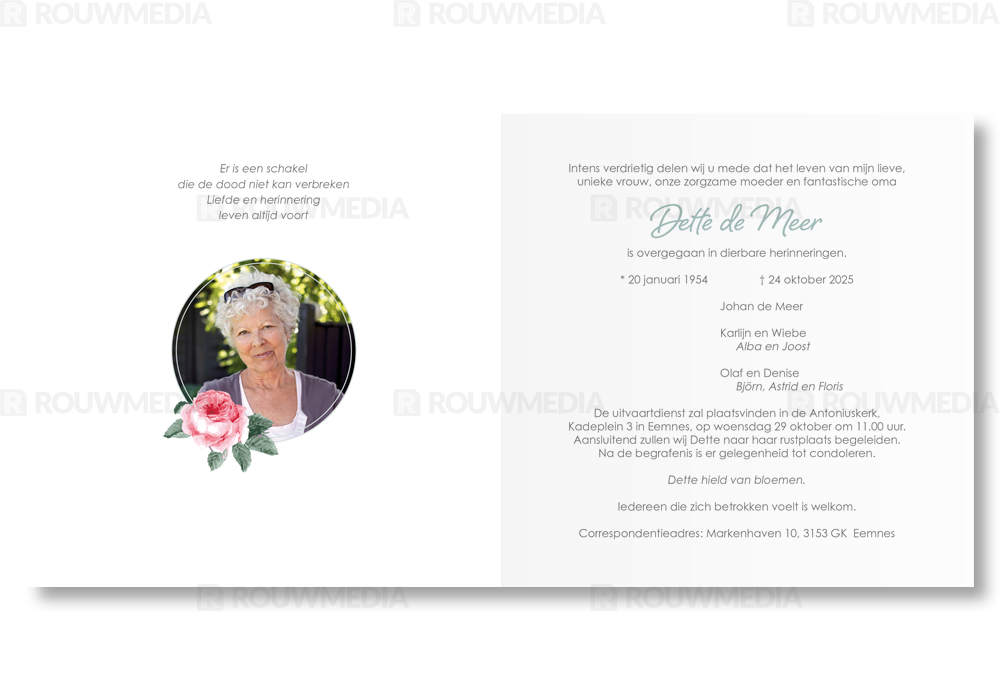 In deze vierkante rouwkaart wordt de naam en datums van de overledenen centraal gezet. Door een ronde cirkel met vleurige pioenrozen wordt de naam extra geaccentueerd.