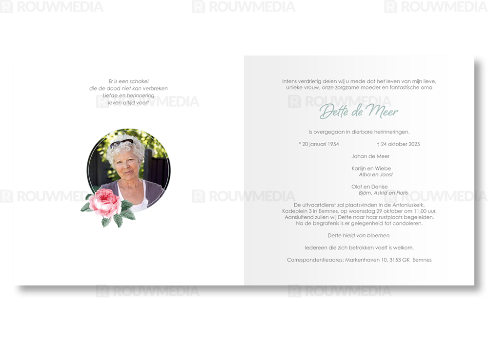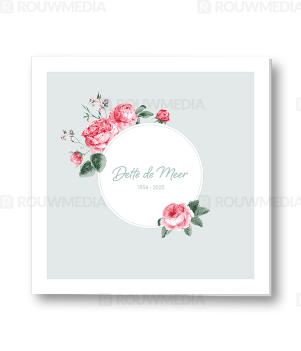 In deze vierkante rouwkaart wordt de naam en datums van de overledenen centraal gezet. Door een ronde cirkel met vleurige pioenrozen wordt de naam extra geaccentueerd.