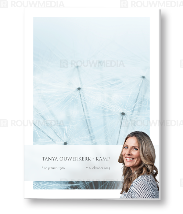 In de staande rouwkaart wordt een beeldvullende foto weergegeven van een pluizenbol. Daarnaast is het mogelijk om een portret/foto naar eigen keuze rechts weer te geven naast de naam en datums.