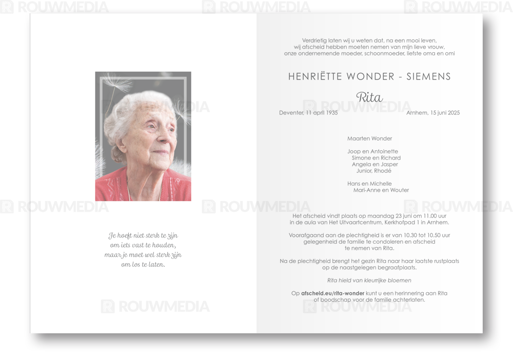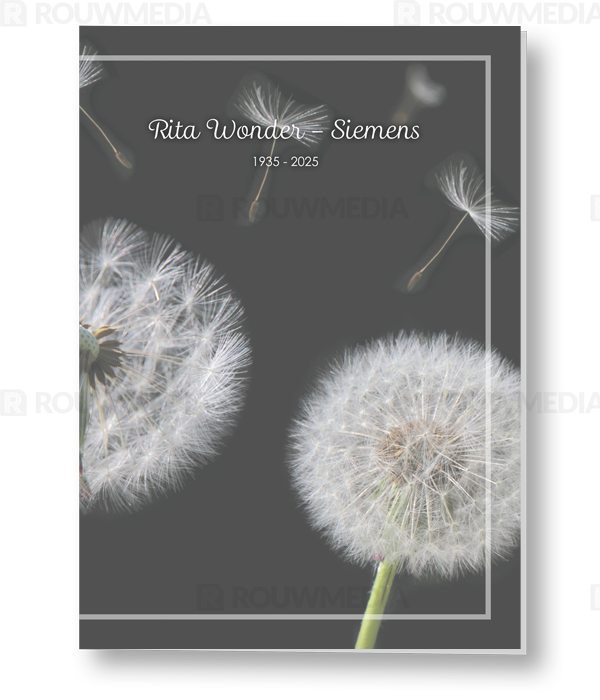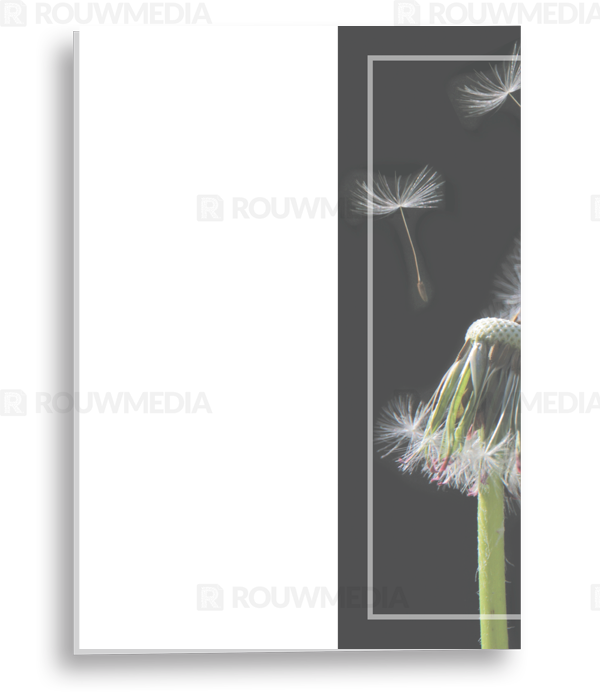 In de staande rouwkaart wordt een beeldvullende foto weergegeven van vliegende pluizen van een paardenbloem.