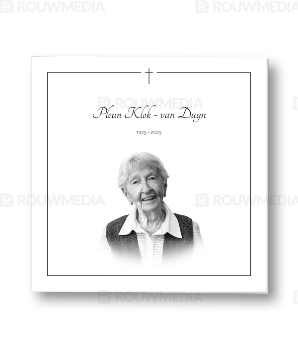 Bij deze rouwkaart heeft u de mogelijkheid om een eigen foto of portret weer te geven in een stijlvol zwart-wit kader