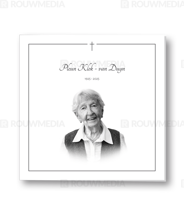 Bij deze rouwkaart heeft u de mogelijkheid om een eigen foto of portret weer te geven in een stijlvol zwart-wit kader