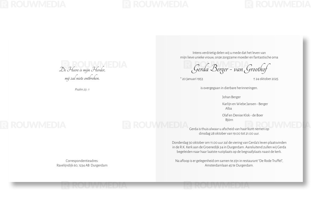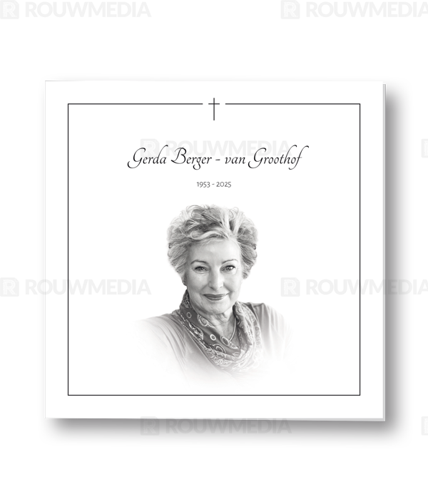 Bij deze rouwkaart heeft u de mogelijkheid om een eigen foto of portret weer te geven in een stijlvol kader met kruis.