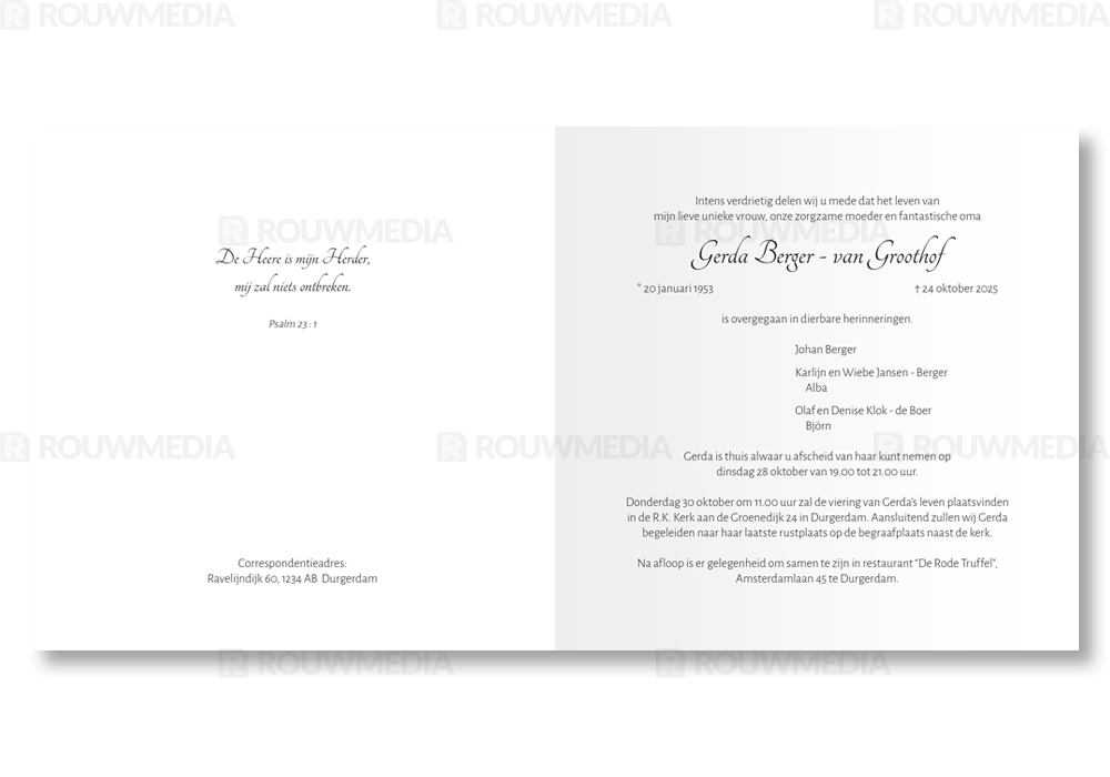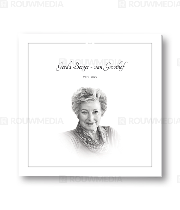 Bij deze rouwkaart heeft u de mogelijkheid om een eigen foto of portret weer te geven in een stijlvol kader met kruis.