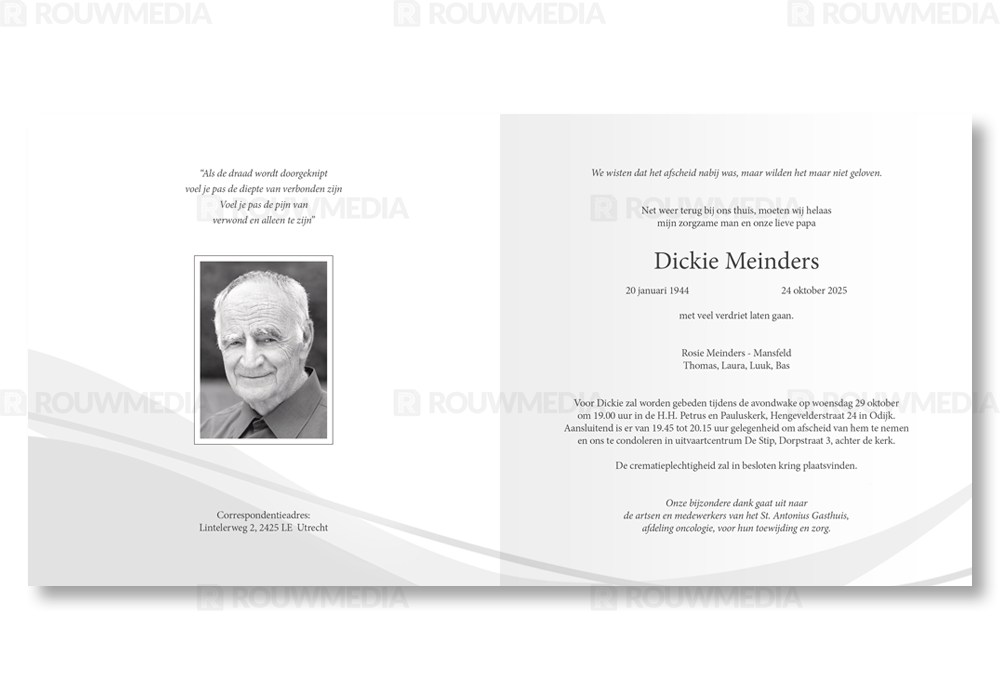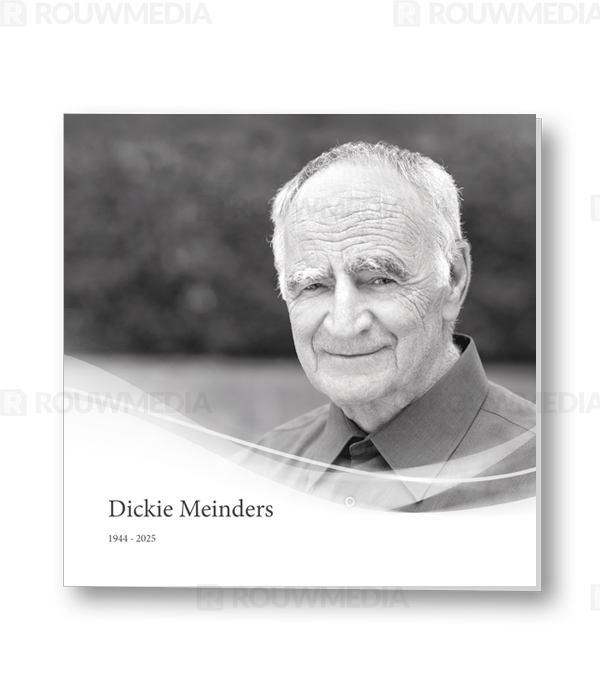 Staande rouwkaart met mogelijkheid om een portret of afbeelding in zwart-wit weer te geven. Onder de afbeelding kunnen de naam en data worden neergezet.